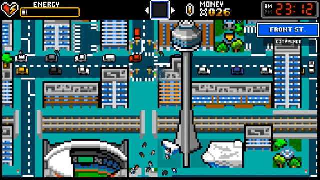 The game takes place in a top-down pixelated rendition of downtown Toronto, Canada. A vibrant pixelated urban playground, with plenty of landmarks, restaurants, stores, and even people to discover.