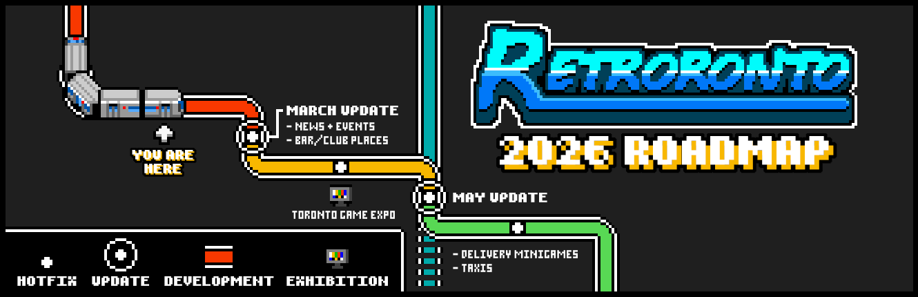 On the showcase front, exhibitor passes are officially secured for Toronto Game Expo, running March 28–29. This will be Retroronto’s second time at TGE, the same event where the game first debuted publicly and unexpectedly went viral on TikTok. With a larger, more polished build this year, we’re hoping for an equally strong showing.